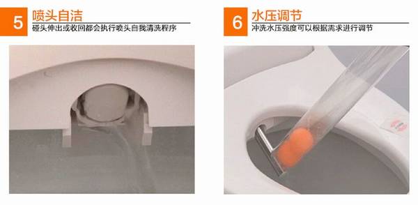 方便智能的功能:即洗即热、自动节电、超节电、简便拆装、水温调节、灵敏皮肤感应、LED夜光灯、喷嘴位置调节、便座温度调节、水压调节。