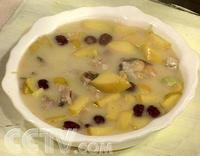 我们先将2个苹果去核、去皮、切成瓣,用清水泡一下放在一边,将100克的草鱼杀洗砍成块,瘦肉切成大片,红枣泡洗干净,生姜去皮切片。把鱼切成鱼块用小火煎至两面稍黄,再放入绍酒2克,加入150克瘦肉片、10克红枣,再注入清汤,用中火炖至汤稍白,加入苹果瓣,调入盐8克、味精2克、胡椒粉少许,再炖20分钟就可以出锅食用。要注意的是炖时调味料不能下得过早、以免汤汁不白。影响了汤汁的味道。