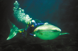 鲸鲨靠捕食热带或者亚热带海中的小鱼或浮游生物生存, 鲸鲨捕食时会张大嘴静止在水面下,象是一个大过滤器。 鲸鲨作为最大的鱼类通常有15m(50ft)长,18吨重。 鲸鲨通常不会对人类造成危险,但如果鲸鲨认为你是敌人,它们也会主动撞击小船、袭击人类。