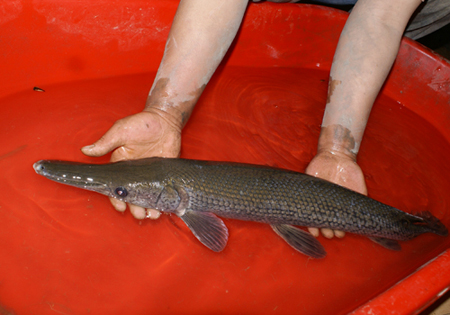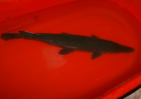 5月21日上午10时,大石桥市石佛镇魏家塘村村民魏凯在辽河里下“诱网”捕鱼时,进入网里的一条大鱼让他兴奋不已,当他看清鱼的特殊形状时,顿时惊呆了,这鸭子嘴形状的鱼难道是电视里常报道的“中华鲟”?顾不得多想,魏凯赶忙将鱼装进编织袋小心翼翼地送回了家。到魏家塘村魏凯家观看“怪鱼”的村民络绎不绝,村里年龄最大的村民也啧啧称奇:“鱼嘴像鸭嘴,鳞片呈菱形,还没有背鳍,这形状的鱼可从来没见过,这是一条啥鱼啊?” 5月25日傍晚,到魏凯观看“怪鱼”的村民仍然络绎不绝。在一只大塑料盆里,记者看到了这条“怪鱼”:鱼嘴扁长11公分,像鸭嘴,嘴里有两排细密的牙齿,每根牙齿长约0.5毫米,两只鼻孔长在嘴的前端上方,浑身黝黑,鳞片呈规则的菱形,鳞片坚硬,每片鳞片有成人的小指甲大,背部没有背鳍,尾巴呈扇状且摆动有力,“怪鱼”长74公分。4天来,魏凯没有听到鱼发出叫声,和这条“怪鱼”放在一个盆里的几条小鱼也毫发无损。 魏凯今年32岁,家里种有几亩水田,农闲时他到2公里远的辽河里下网捕鱼贴补家用,最多时一天曾经捕获1000多斤鱼,最重的花鲢达20多斤,最近几天,魏凯经常在网中发现几斤重的甲鱼,都被他放回辽河里。这条怪鱼送到家时,有人想购买送人,有人想买回去观赏,都被魏凯拒绝了,眼下魏凯最想知道的是,他捕获的这条鱼究竟是条什么鱼? 记者在网上查到,有种被称作淡水鱼杀手的“雀鳝鱼”形状和这条鱼相似,但是想揭开这条怪鱼的身份,还得求助于水产专家。