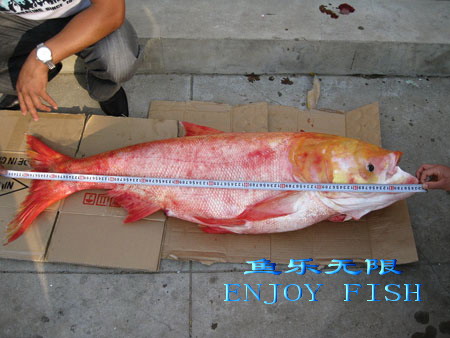 大家经过测量才知道,这条红色大鱼长120厘米,宽34厘米,胸围85厘米,头部长40厘米,嘴