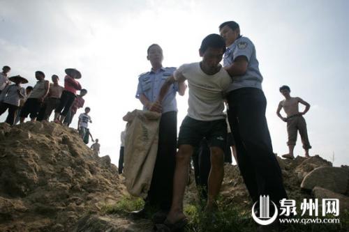 有关人员铐走抢鱼的男子,稳定现场的秩序