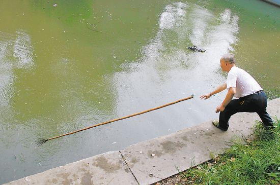 记者马上赶到了现场,看见运河边围满了上百位市民。看到河边有一位老人正在飞叉刺鱼,
