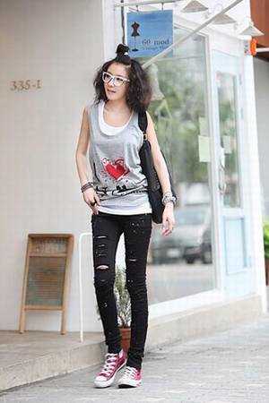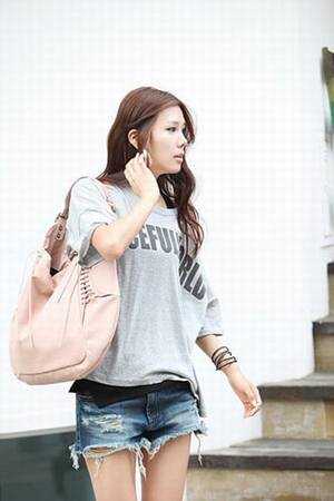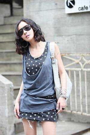 衣缘网点评:灰色宽T搭配黑色背心,毛边牛仔裤露出修长的双腿。
