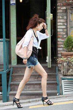 北京时尚试衣网点评:白色衬衫打结穿在腰间,随性自然,搭配短裤和罗马凉鞋,帅气十足哦。