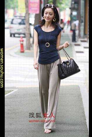 时尚解析:这种真丝裤子具有很强的垂坠感,宽腿设计飘逸动人,充分遮盖不完美的腿部曲线,上身搭配修身T恤,实在是美。