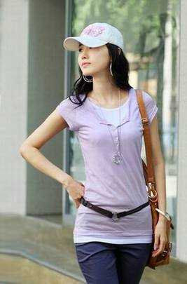 点评: 粉紫色T内搭白色紧身T,爽口爽心的美丽色彩。