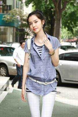 点评:宽松衬衫是今夏的热门单品,内搭条纹T,很有层次感,白色腰带与白色裤装很协调。