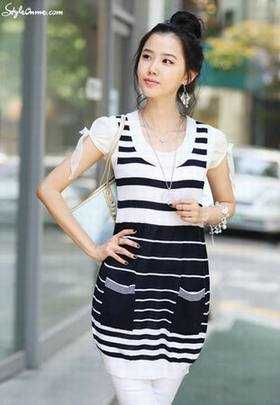 点评:黑白条纹背心针织衫内搭配白色短袖,清爽的人气搭配,上班约会通勤装。