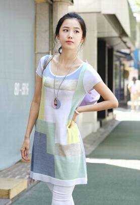 点评:彩色拼接色块针织淑女长款T,可以当连衣裙穿着哦,人见人爱的冰淇淋女生。