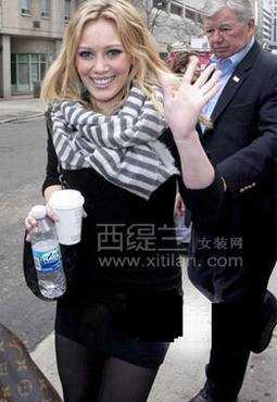 点评:黑色的上衣.下搭配性感的黑色丝袜,最明显的还是黑白条纹的围巾.