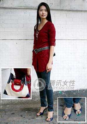 时尚韩国14年韩国街头服饰亮点:以包包的色系来确定全身配色方案——葡萄酒红色与蓝色搭配,高饱和度色彩对撞出朝气十足的轻熟女风格。与开襟同色的条纹打底衫和造型精致的海军蓝冷调鱼口鞋是不错的moko韩国服饰。