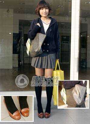 时尚韩国服装亮点:咖啡色小圆头平底皮鞋为灰白黑色系的着装增添一点亮色。蛇皮纹亮皮包包,大而实用,包包上搭配一条随意绑系的韩国代购服装网址丝巾,是今年很in的丝巾配法.