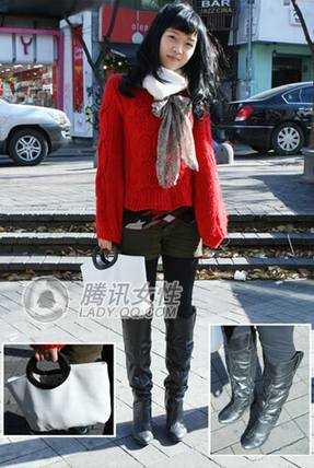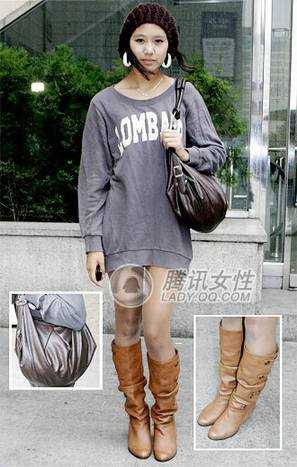 时尚韩国服装亮点:灰色字母长t恤休闲舒适,铆钉的咖啡色长靴和针织贝雷帽与早春天气非常符合。银色包包和白色大耳环增添不少女士味。不过对于16岁的mm来说,这么打扮稍有点成熟哦。