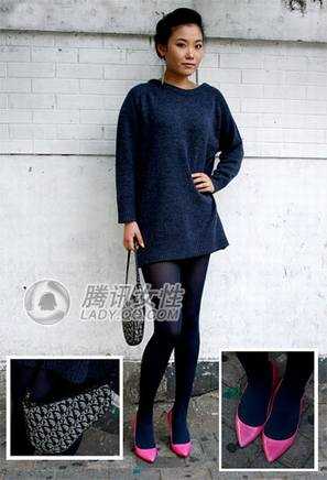 时尚韩国服装亮点:深蓝色针织套头衫,要穿出时尚味道,与师奶区别开来,搭配性感的丝袜和亮眼的桃红色尖头14年韩国街头服饰是关键。小巧别致的dior马鞍包包更突显名媛身份。长款的流苏耳饰增添更多女士味。