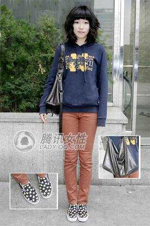 深蓝色帽子运动衫+浅褐色铅笔裤+卡通帆布鞋+银色包包