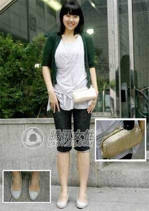 白色褶皱雪纺上衣+墨绿色高腰针织开襟衫+七分牛仔铅笔裤+浅银色亮皮休闲鞋+亮片包包