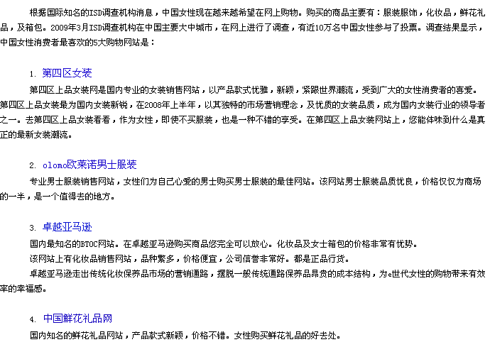 4. 服装购物网站排名,美国服装购物网站 - 珠江纺织服装网 - 美国网路购物网站Amazon并购成衣网路零售商Shop..美国网路购物网站Amazon并购成衣网路零售商Shopbop [日期:2011-3-11 11:06:18] [字体:大中小] l 美国网路购物网Amazon.com已经并购成衣网路零售商Shopbop.com,纳入Amazon购物网,销售成衣及配件等产品。 l Shopbop主要销售75个设计师品牌...