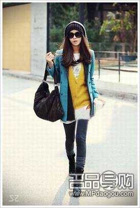 A:蓝绿色的衣服可以搭配柠檬黄、樱桃色、青椒绿、鲜红等颜色,带有光泽会有膨胀感,所有用腰带收腰。