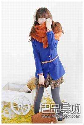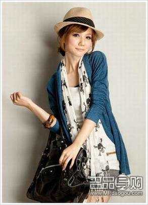 蓝色除了与黄色相配,红蓝色组合,则使人显得妩媚、俏丽,再配以碎花裙,显露出一种自我个性,从而变得明快起来。包与橘红色围巾腰带相呼应则更出彩。