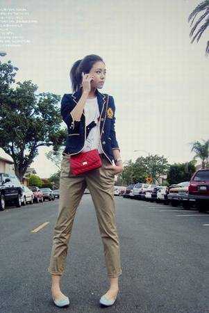 搭配风格:英伦风小制服非常修身,香奈儿风格的小挂包的红色与蓝色搭在一起很好看,出挑抢眼的搭配。