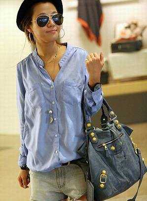 搭配风格:宽衬衫配小短裤张扬中性风格的性感,牛仔布与金属钉结合的包包金属摇滚味十足,非常帅气。