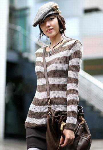2.褐色毛衣配褐色格子长裤,可体现雅致和成熟。褐色厚毛衣配褐色棉布裙,通过二者的质感差异,表现出穿着者的特有个性。
