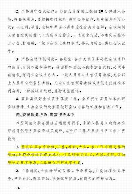 河南省郑州市政府办公厅日前下发了严肃工作和会议纪律的有关规定,要求机关工作人员注意服装的款式、色彩、搭配,不能大红大绿,不可乱穿乱戴。