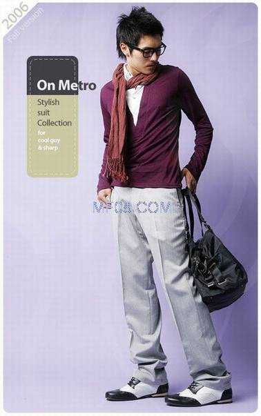 弯曲腿型的男士,要注重裤装与上衣的搭配关系。下装在色素上应比上装淡些,面料宜带有毛质感。整体着装上不宜朝深调发展。在款式上,上装变化宜多些,视线可集中在上部,如加适量的配饰等。