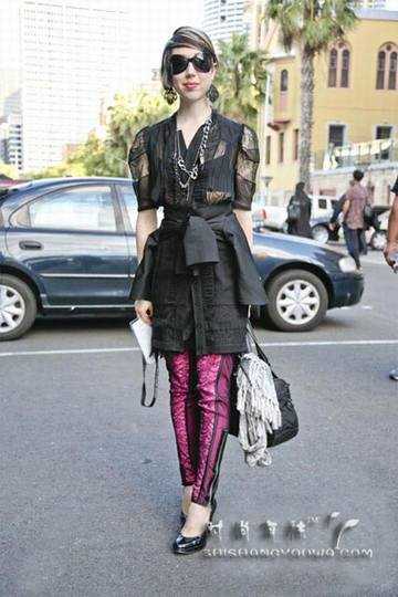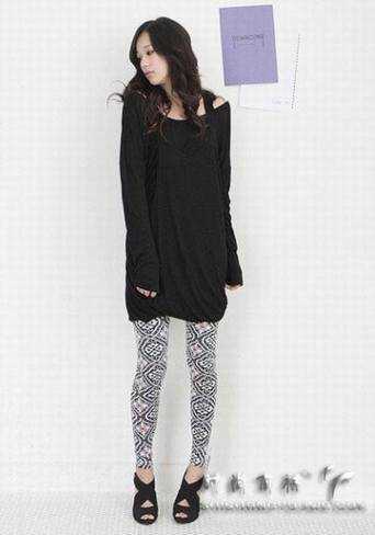 时尚解析:黑色宽松长衫看起来很有女士味,搭配有黑色图案的legging。legging整体色泽较浅,为了避免头重脚轻,脚上的黑色高跟鞋很关键!而下方蛇皮纹legging的街头搭配更加大胆,露肩式上衣可以弥补身材的缺陷,看起来也更潇洒时尚!