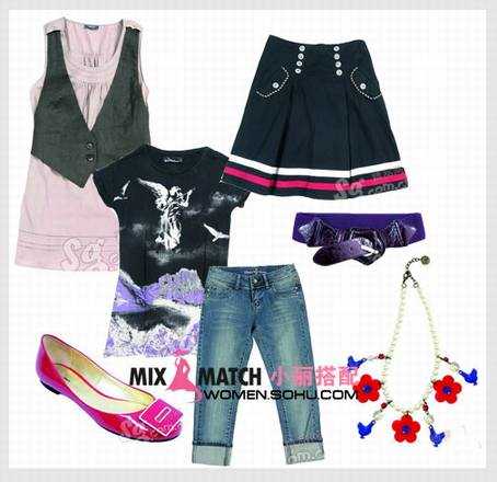 搭配支招:选择修身的中长款背心避免了小腹的突出,领口周围的以及A字裙上白色的扣子,可以模糊凸起的小腹,另外脖子上的也是转移视觉的焦点。