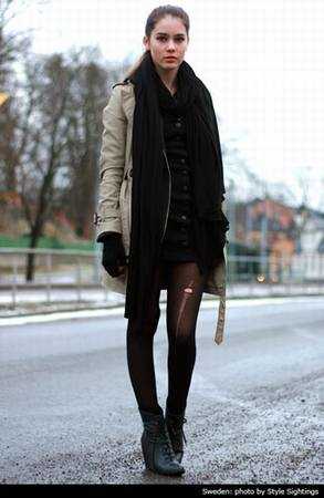 时尚服饰搭配点评:这位是瑞典MM啦。很喜欢她里面穿的连身和外面中长米色大衣的搭配。有点英伦风,不过丝袜又显出来了一抹叛逆。