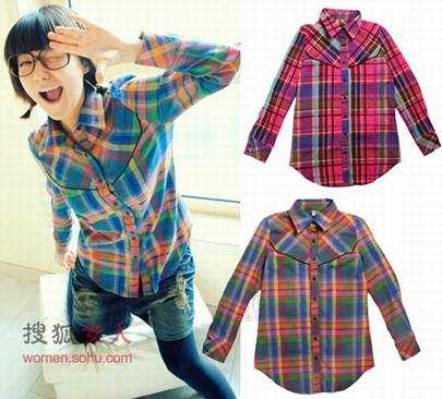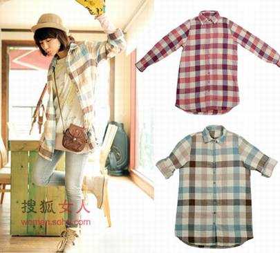时尚解析:最普通的格纹衬衫、男款样式,就像将男友的大号衬衫套在身上一样,温馨、甜蜜。可以将袖口翻起,内套一件带有图案装饰的T恤,选择这样穿着方式是不是非常别出心裁呢?