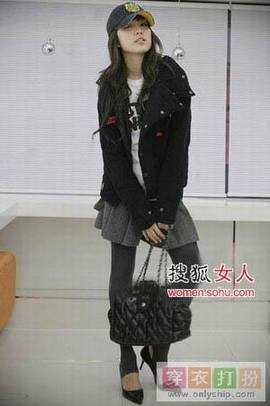 制服风格外套+棒球帽+毛呢褶皱短裙+高跟鞋,虽然春天要来了但还是会有点凉,外套一定要稍厚一点。