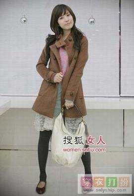 双排扣大衣+蕾丝花边短裙+芭蕾舞鞋,很有女士味,逛街也方便。