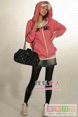 彩色帽衫+迷你牛仔短裙+链条拎包,时尚达人的混搭风哟。