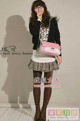 带帽翻毛棉服+淑女百褶裙+粉色小挎包,露出长腿迎接春天来临。