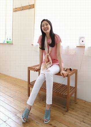 图示:粉红上衣,白色长裤,衬托你的修长娇美