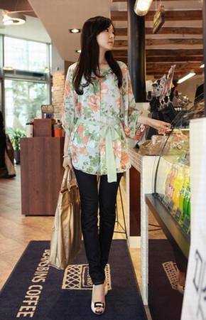 天蓝色的衬衣,配上深色的大花,十分有名媛气质