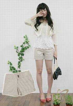 春天服装小短裤点评:米白色的格纹短裤看起来颇为清新明快,搭配可爱的蕾丝上衣,非常淑女呢,红色的尖头平底鞋就透露着春日浓浓的热情了~这款裤子的设计属大方简洁类,相信会深得OL的喜爱。