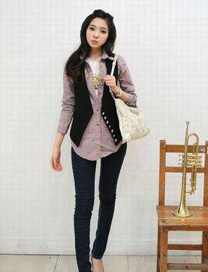 收身效果极佳的黑色长马甲非常适合个子较高的女生儿,里面搭配长衬衫在视觉上有明显的拉伸作用,马甲上面的一排银色纽扣也起到装饰的作用。瘦腿仔裤搭配简洁的高跟鞋更是将身形最大限度的美化。