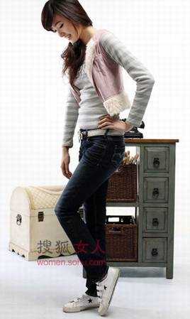 时尚解析:轻松感马季与细脚裤牛仔裤搭配,是非常时尚的穿法。裤子建议不要太长,搭配平底球鞋是最经典的组合。