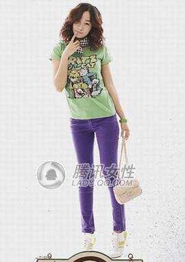 喜欢糖果风格的甜美女生一定抵挡不住彩色字母和可爱卡通印花的诱惑。今年春天大热门单品——彩色铅笔裤搭配同样色彩光鲜的卡通tee,色彩冲撞出无限青春活力。如果你是sweet派的糖果女生,将紫色铅笔裤换成粉色就轻松变成甜美造型啦!