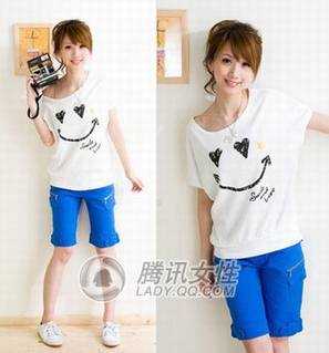 夏天服饰搭配方案:白色卡通笑脸蝙蝠袖休闲tee+亮蓝色短裤