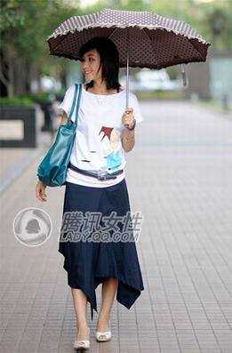 夏天服饰搭配方案:卡通图案白色tee+藏青色不规则裙边长裙