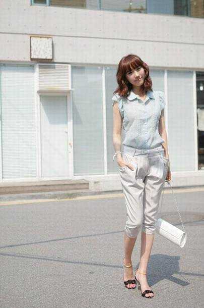 蓝色合身搭配米色裙裤,像夏日冰淇淋般可人。