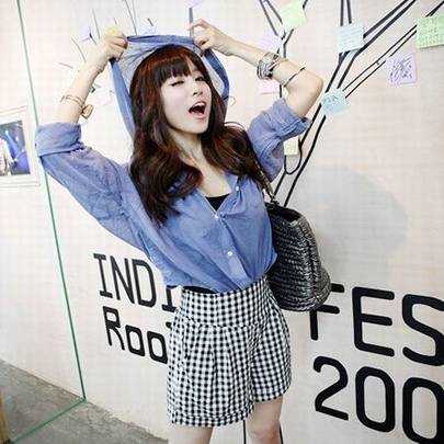 灰蓝色的轻薄质地,穿上很舒适,连帽衬衫是今年的新品哦,搭配短裤穿着,时尚可爱。$ l- P3 x, ju' CH# D# pl. q