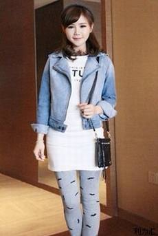 短款牛仔外套,搭配长款修身T恤,超显比例的哦,打底裤和白色平底休闲鞋搭配起来显得更大方。