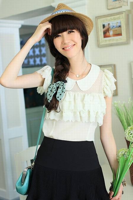 很淑女浪漫的雪纺衫,前身层叠缜密的荷叶边和袖口相呼应,荷叶袖口,不显手臂上的肉肉。可爱娃娃领,充满俏皮感,清新自然。