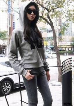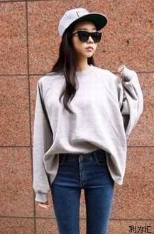 灰色款式卫衣宽松的设计很有Boyfriend的感觉。搭配紧身印花牛仔裤,运动鞋,鸭舌帽,女装上衣前摆内塞进裤子的造型很时髦,整体上宽下窄显瘦效果佳。